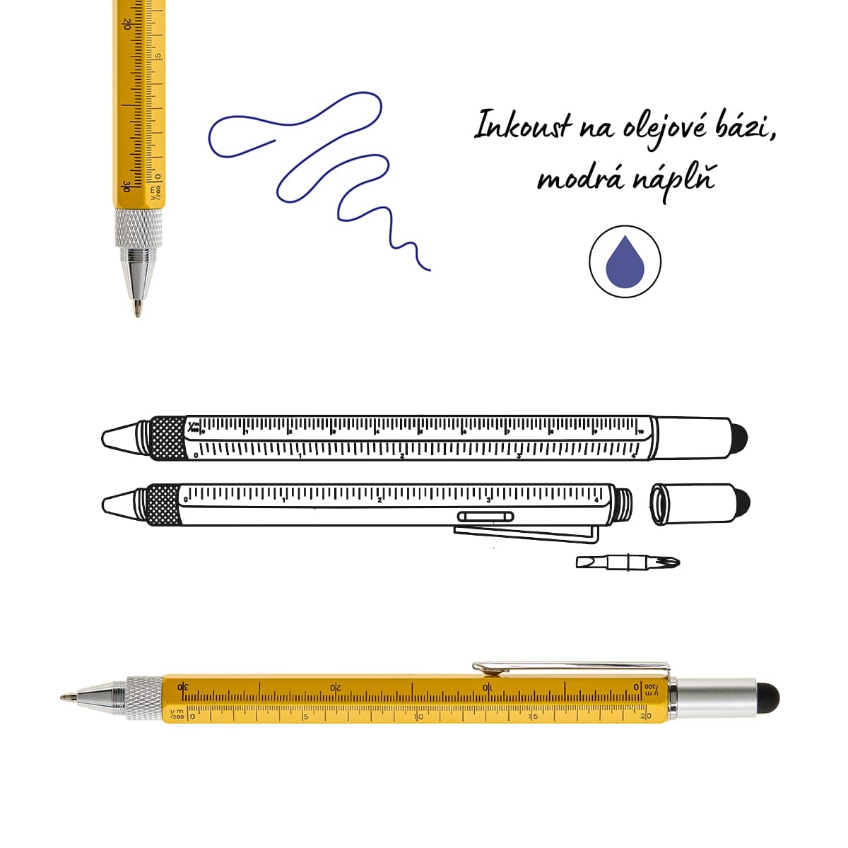 multifunkční kuličkové pero 5v1, kuličkové pero, pravítko v cm i palcích, vodováha, plochý a křížový šroubovák, dotykový stylus pro tablety a smartphony, modrá náplň, inkoust na olejové bázi, žlutá barva, stiskací mechanika, balení v blistru, rozměry 155 × Ø 13 mm