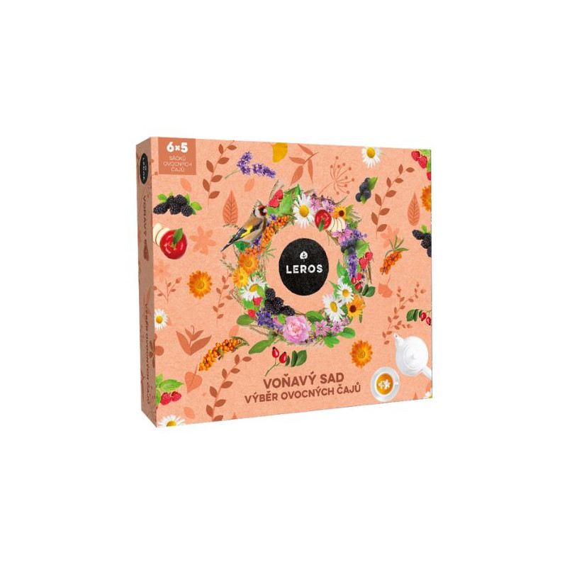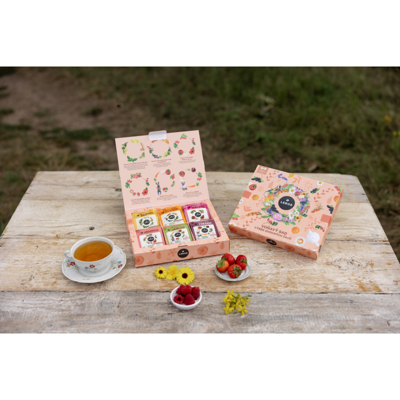 Popis k výrobku: Dárková sada LEROS - Voňavý sad Dárková kazeta Voňavý Sad obsahuje šest druhů lahodných čajů, které potěší všechny milovníky bylinek a ovoce. Sada obsahuje: Čajový dýchánek – Lípa & Zázvor, Čajový dýchánek – Rakytník & Pomeranč, Čajový dýchánek – Šípek & Malina, Čajový dýchánek – Jahoda, Dětský čaj – Jablko, Dětský čaj – Třešeň