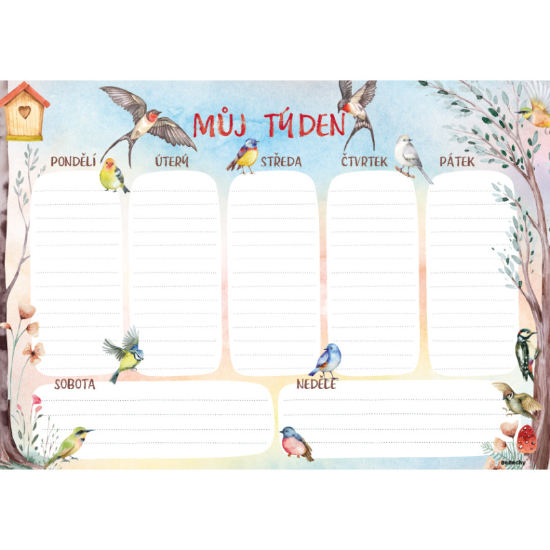 Popis k výrobku: Plánovač týdenní A4 - Ptáčci strukturovaný přehled týdne, který vám pomůže lépe rozvrhnout čas, nabízí prostor pro pracovní úkoly, schůzky i osobní poznámky, je skvělým nástrojem pro každodenní organizaci bez stresu, lepená vazba, ofsetový papír 90 g/m², 100 stran, 50 listů, rozměry 297×210 mm (A4)