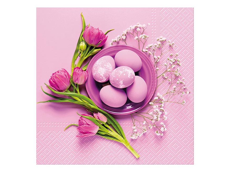 Pastelové barvy a jemné květinové aranžmá velikonočního ubrousku s růžovými vajíčky a tulipány vytvářejí harmonický a elegantní motiv. Celkový vzhled působí lehce a svěže a snadno zapadne do jarně laděného stolování. Použitý třívrstvý papír je pevný a savý. Motiv: kraslice, květy Rozměr: 33 × 33 cm POČET UBROUSKŮ V BALENÍ: 20 ks Uvedená cena je za 1 balení (20 kusů).
