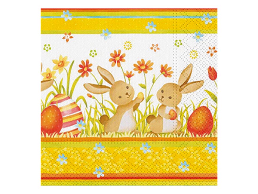Jarní ilustrace se zajíčky mezi květinami a barevnými vajíčky vytváří veselou a přívětivou scénu plnou pohody. Teplé žluté tóny, květy a jemné detaily dodávají motivu hravost a příjemnou velikonoční náladu. Velikonoční ubrousek se uplatní při rodinném stolování, sváteční snídani i velikonočním pohoštění. Ubrousek je vyroben z třívrstvého papíru, který je pevný a dobře saje. MOTIV: zajíčci, květiny, velikonoční vajíčka POČET UBROUSKŮ V BALENÍ: 20 ks Uvedená cena je za 1 balení po 20 ks.