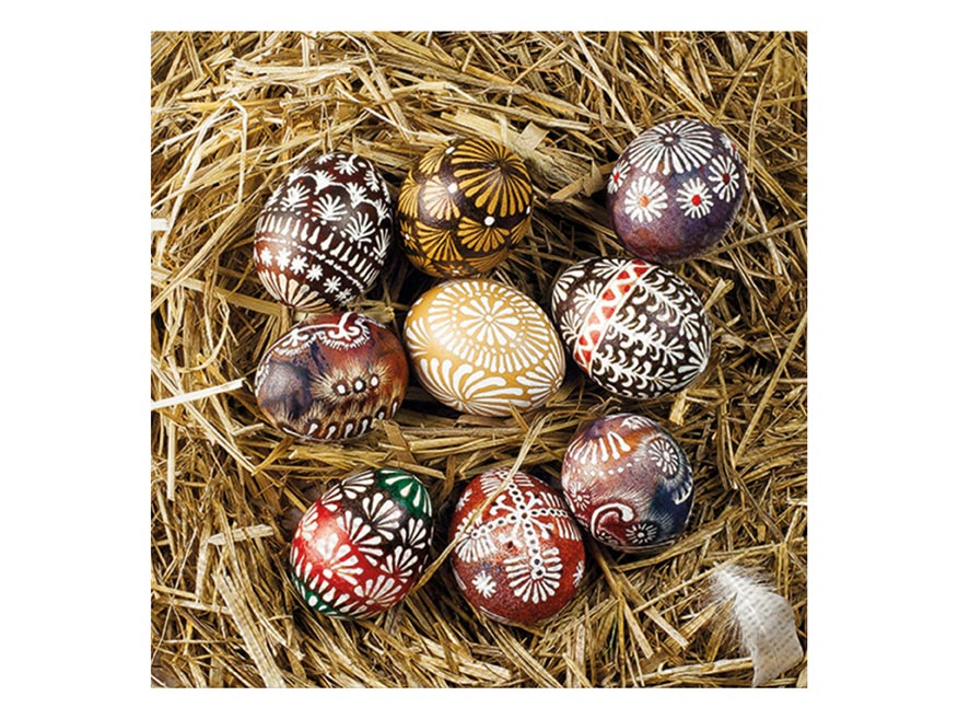 Tradiční zdobené kraslice uložené ve slámě vytvářejí výrazný a autentický motiv, který odkazuje na lidové velikonoční zvyky. Přírodní barevnost v kombinaci s bohatými ornamenty dodává velikonočnímu ubrousku rustikální a hřejivý vzhled, který okamžitě evokuje sváteční atmosféru. Motiv je ideální pro klasicky laděné velikonoční stolování a potěší každého, kdo má rád tradice a řemeslný styl. Třívrstvé provedení zajišťuje potřebnou pevnost a savost při používání. Motiv: kraslice Rozměr: 33 × 33 cm POČET UBROUSKŮ V BALENÍ: 20 ks Uvedená cena je za 1 balení (20 kusů).