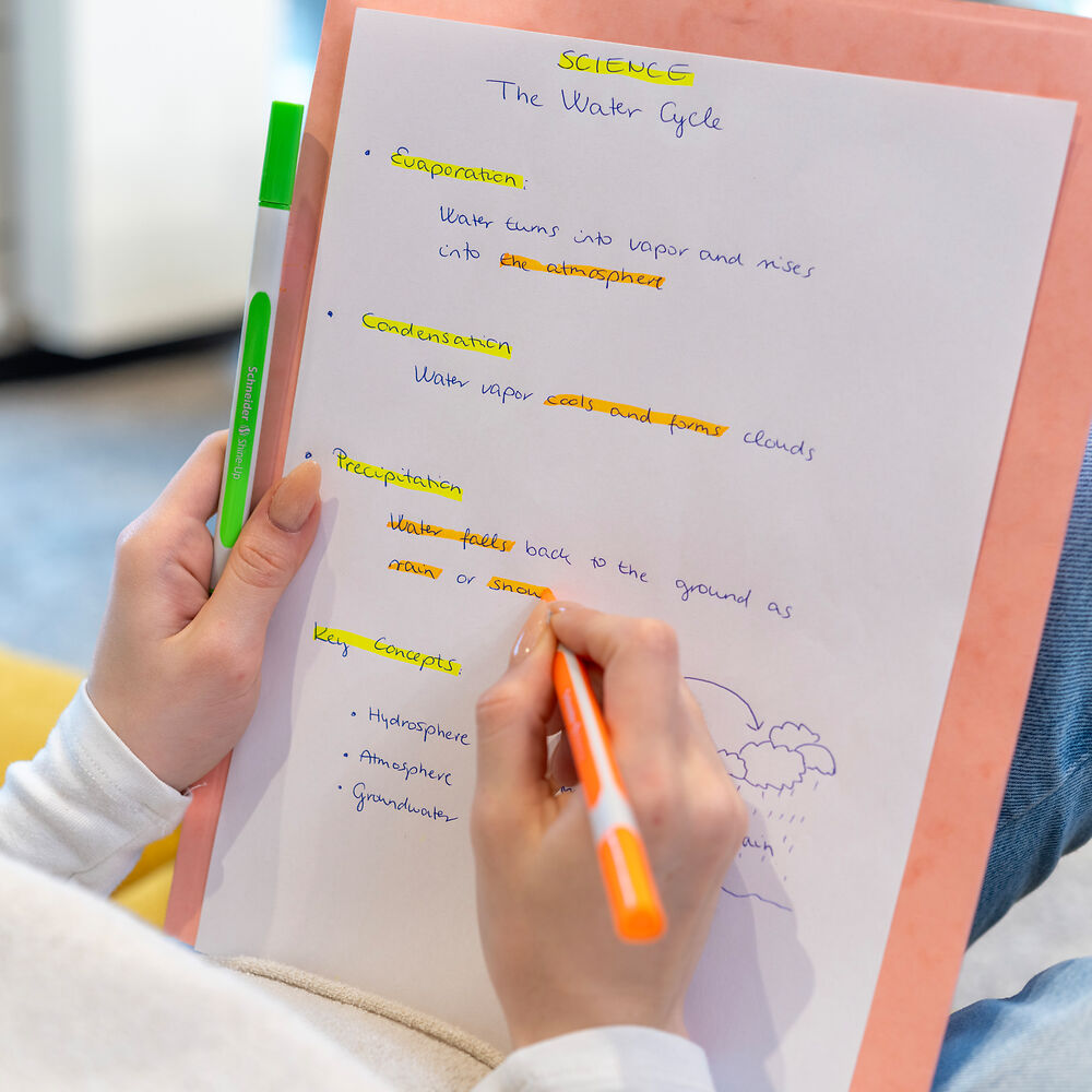 Zvýrazňovač Schneider Shine-Up se seříznutým hrotem a tenkým ergonomickým tělem vyrobeným z více než 80% z bioplastu.