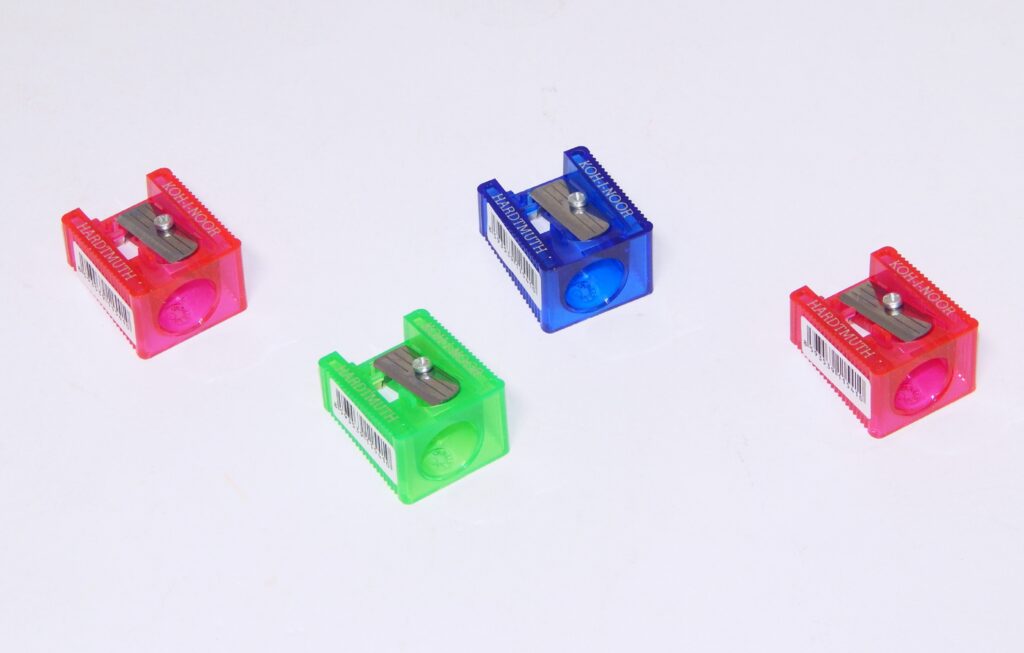 Výrobek se používá jako školní ořezávátko, pro zaoblené špičky. Plastové ořezávátko s O 12 mm, v barvách modrá, zelená, oranžová, žlutá. Na bočních stranách vroubkovaný povrch, zkosené. Délka 29 mm, šířka 24 mm, výška na delší straně 18 mm, na kratší straně 12 mm.