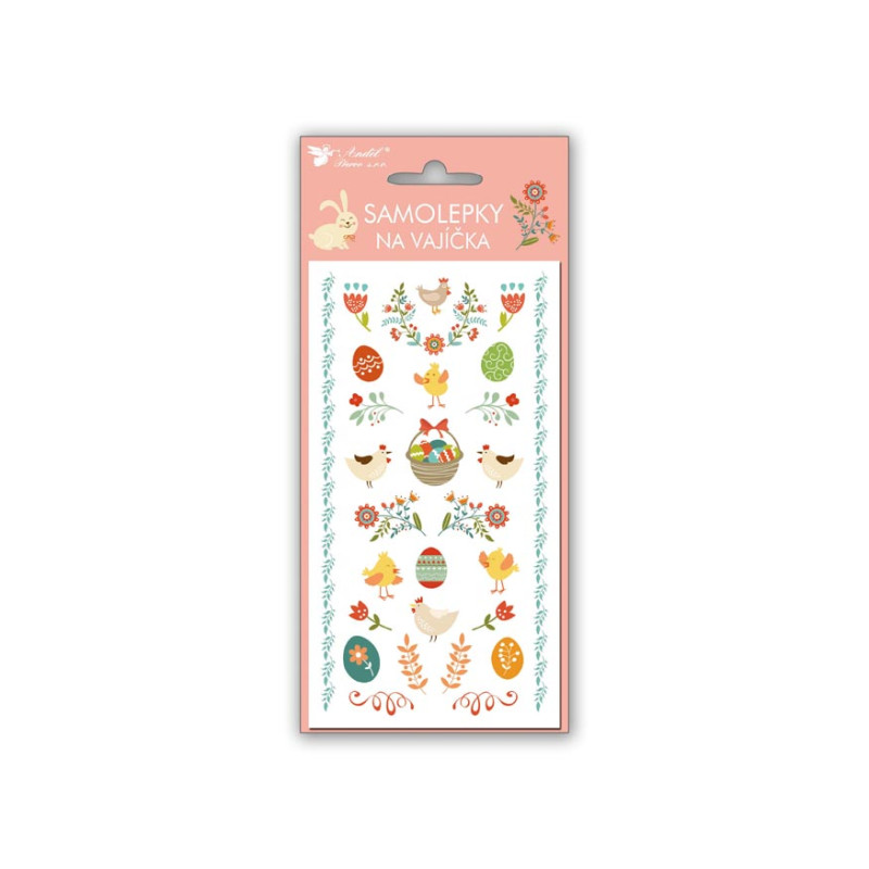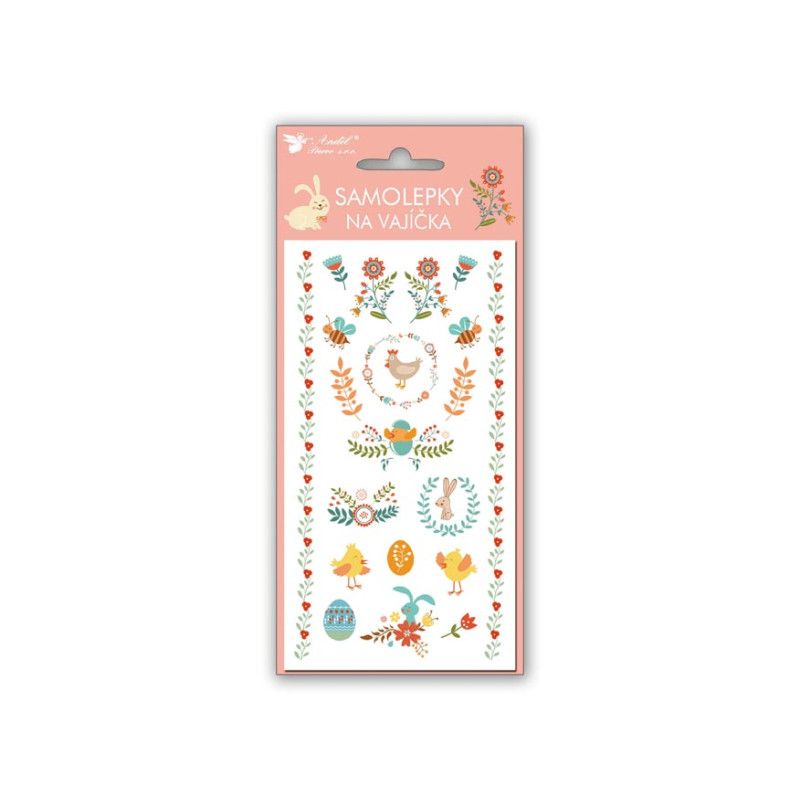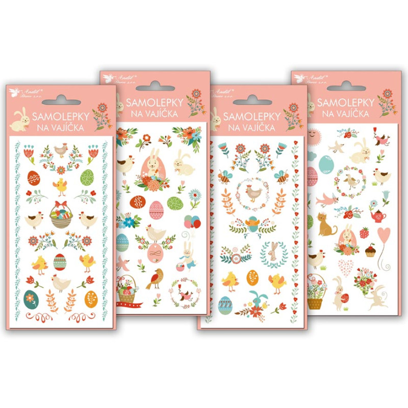 Samolepky na velikonoční vajíčka, na kterých jsou vyobrazeny obrázky velikonočních vajíček, kuřátek, oveček, ptáčků a dalších jarních a velikonočních motivů. (ve 4 provedeních)