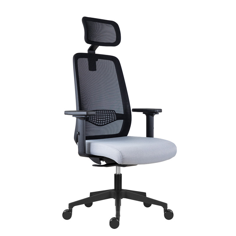 židle s výškově a úhlově nastavitelným čalouněným podhlavníkem PDH, černou síťovinou na opěráku a nastavitelnou bederní výztuhou, pohodlný čalouněný sedák, synchronní mechanismus SYN-SL se čtyřnásobnou aretací, s automatickým nastavením síly protiváhy a nastavením hloubky sedáku, černá nylonová nebo aluminiová báze (leštěná nebo černý matný lak RAL 9005), volitelné područky, kolečka Ø 60 mm pro měkké povrchy, nosnost 150 kg, český výrobek, záruka 36 měsíců