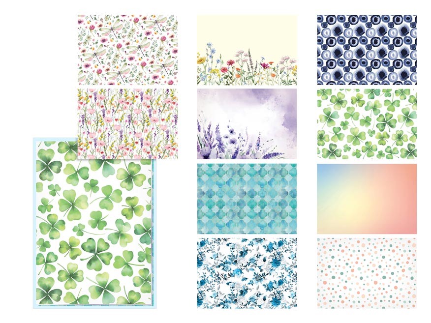 Barevný mix obsahuje různé motivy – od jemných květin a přírodních vzorů až po moderní a hravé designy. Každá obálka působí esteticky a výrazně, takže sama o sobě vytváří zajímavý vizuální prvek.