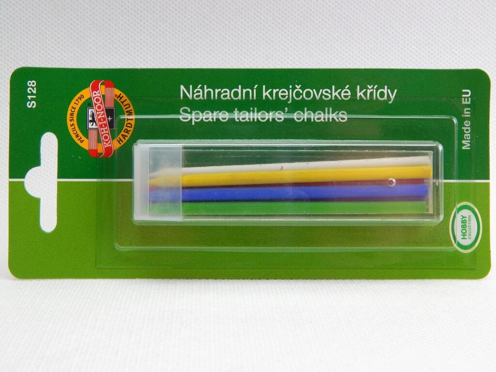 souprava 6 ks krejčovských kříd Souprava 6 ks krejčovských tříd v šesti barvách, pr. 3,8 mm, zabalená v plastové etui. Křídy se používají jako náhradní náplň do mechanické plastové tužky 5302, která je určena jako kreslící pomůcka pro švadlenky i pro hobby účely. Etue s křídami v barvách bílá, žlutá, zelená, modrá, růžová a fialová zabaleny v blistru s eurozávěsem.